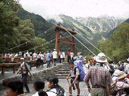 写真を3つ、河童橋の人混みと残雪残る穂高連峰?、環境庁管理の公衆トイレ